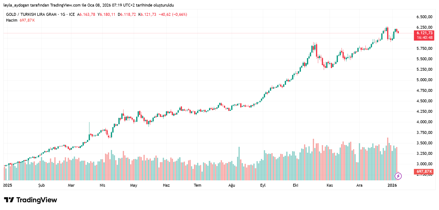 Gram altın, bugün 6.121 TL seviyesinden güne başladı. Ons altın ise yaklaşık 4.428 dolar civarında işlem görüyor. Dünkü işlemlerde gram altın, günün zirvesi olan 6.224 TL’ye kadar yükseldikten sonra kar realizasyonlarıyla geriledi.